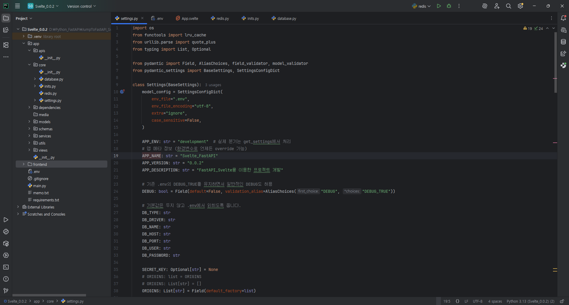 기본 세팅에 필요한 설정들을 담아 놓는 파일이다. 개발과정에 계속 추가 될 수 있다. Pydantic BaseSettings + lru_cache로 한 번만 로드/재사용되도록 정리했고, initialize_app()에서 get_settings()를 한 번만 호출하도록 하였다.